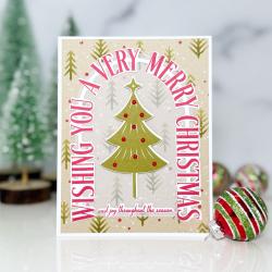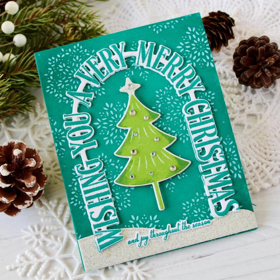Arch – 3 5/8” x 4 3/4”Tree – 2” x 3 3/8”And a happy new year – 1 5/8” x 3/8”And joy throughout… – 2 1/8” x 1/2”
