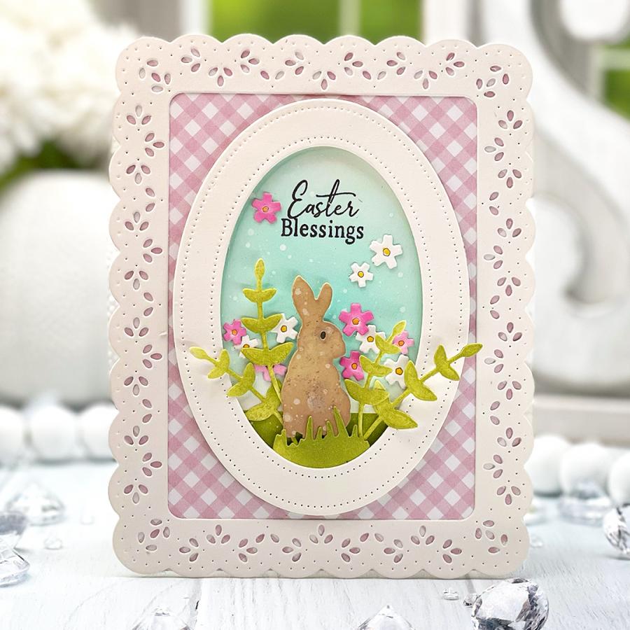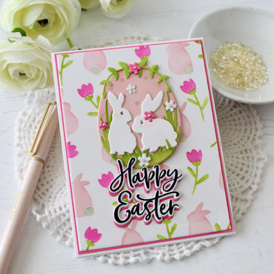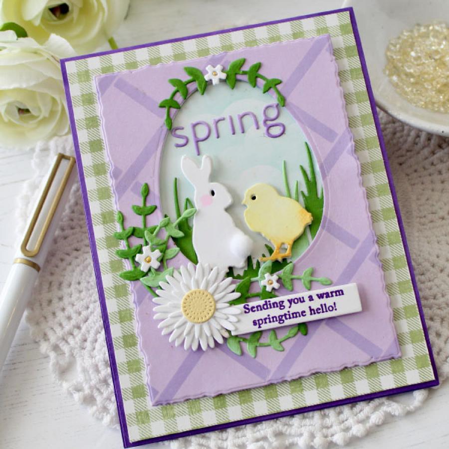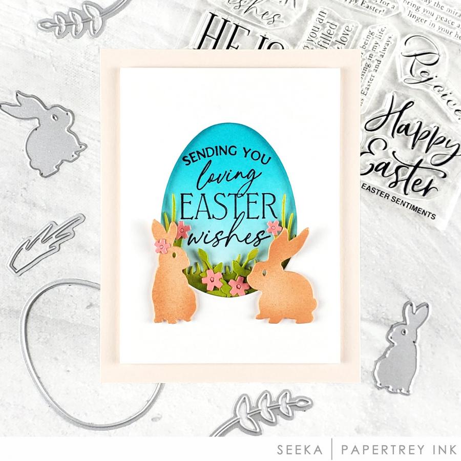 Egg – 2 1/4” x 2 7/8”Bunnies:1 1/8” x 1 5/8”3/4” x 1 3/4”Chick - 1” x 1 1/8”Spring – 1 1/2” x 5/8”Grass:1” x 3/4”3/8”Leaves range in size from: 1/2” x 1” to 5/8” x 2”Flowers:3/8”1/4”