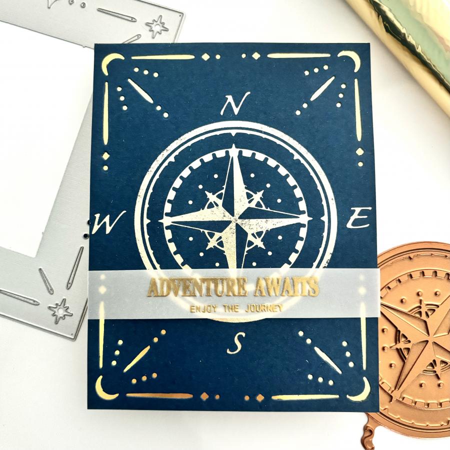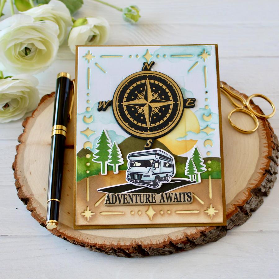 This set comes on two 4" x 6" acetate sheets. The RV measures 1 1/2” x 1 3/8.” The Compass measures around 3” x 3”. The sentiment frame is approximately 3” x 3/4”. The trees are between 3/4” x 1 1/2“ and 1/2” x 7/8”. “Adventure Awaits” sentiment measures roughly 2 5/8” x 1/2”. The “Hit the Road!” measures approximately 2 1/2” x 3/8”. The “Find Your Adventure” sentiment is around 2 5/8” x 3/8”. The sun and moon are approximately 5/8” x 5/8”. The road is around 3” x 3/4”. The decorative lines are 3 1/4” x 1/4”.