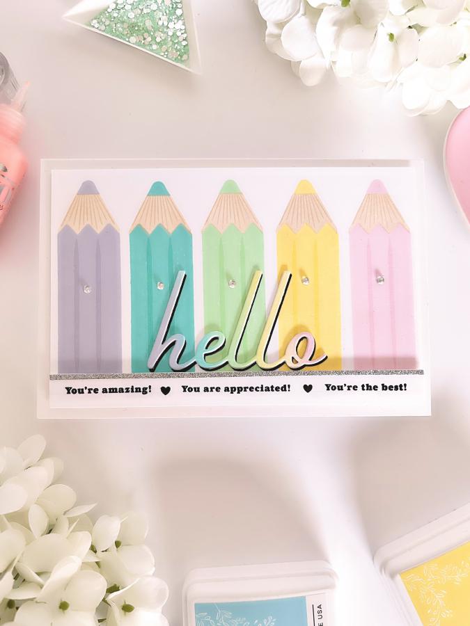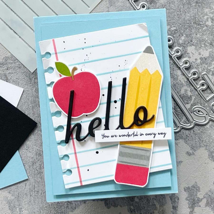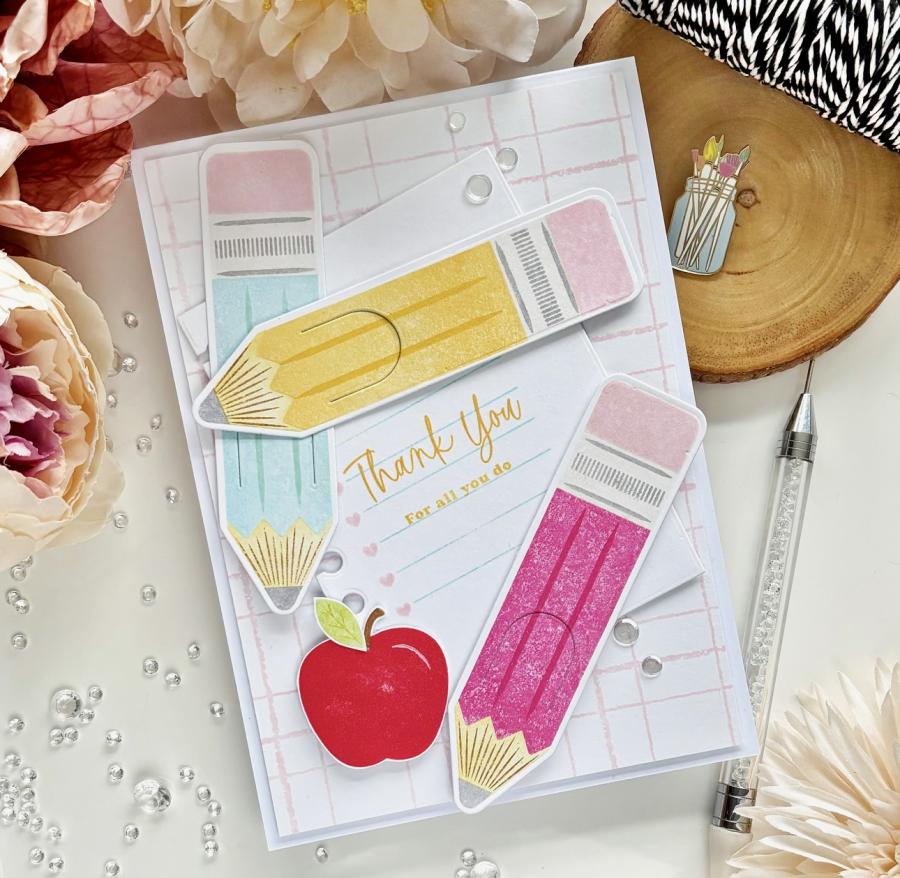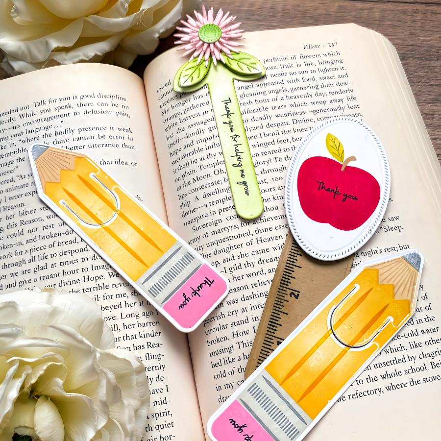 This set comes on two 4" x 6" acetate sheets. The assembled pencil is just over 1” wide and just over 4 3/8” tall. The inches stamp is just under 3/8” wide and just under 3 3/8” tall. The assembled apple is just under 1 1/2" wide and tall. The assembled leaf is just over 1/4" wide and just over 5/8” tall. The animal paw detail is just under 3/4" wide and just under 1/8” tall. The animal face features vary in size from the largest being just under 3/4" wide and just over 1/4" tall and the smallest being just under 3/8” wide and just under 1/4” tall. The assembled nine petal open flower is just under 1 5/8” wide and just under 1 5/8” tall. The assembled five petal open flower is just under 1 5/8” wide and tall. The remaining assembled partially closed flower is just over 1 5/8” wide and just under 1 3/8” tall. The “Thank You For Helping Me Grow” sentiment is just over 2” wide and just under 1/4" tall. The “I Am Truly Grateful For All You Do” sentiment is just over 2 1/8” wide and just over 1/4" tall. The “You Are Wonderful In Every Way” sentiment is just over 2” wide and just under 1/4" tall. The “Thank You” sentiment is just under 3/4" wide and just under 1/4" tall.