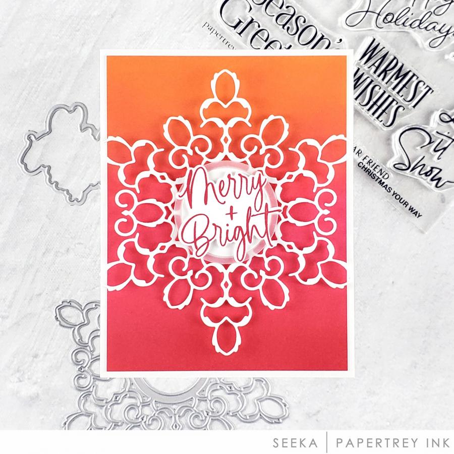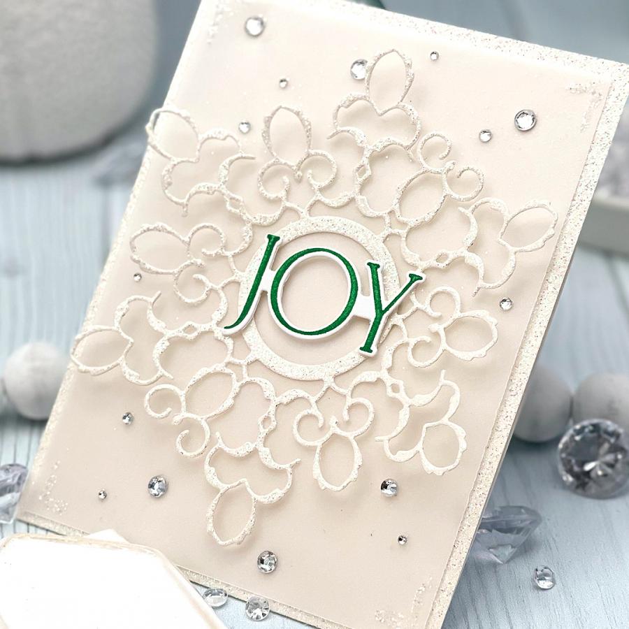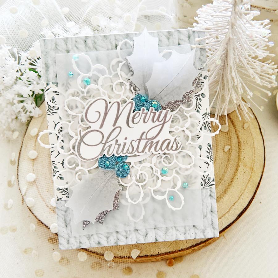 This set comes on two 4" x 6" acetate sheets. The “Merry + Bright” sentiment is just under 1 3/4" wide and just over 1 5/8” tall. The “Joy” is just over 1 5/8” wide and just under 1” tall. The “Let It Snow” sentiment is just over 1 3/8” wide and just under 2 1/4" tall. The “Warmest Wishes” sentiment is just over 1 1/2" wide and just under 1 1/8” tall. The “Season’s Greetings” sentiment is just over 2 5/8” wide and just under 1 1/2" tall. The larger “Merry Christmas” sentiment is just under 2 3/4" wide and just over 1 1/2” tall. The smaller “Merry Christmas” sentiment is just over 3” wide and just over 1/2" tall. The “Happy Holidays” sentiment is just under 2 1/4" wide and just under 1 3/8” tall. The “Peace On Earth” sentiment is just over 1 3/8” wide and just over 2 1/8” tall. The “Tis The Season” sentiment is 3” wide and just over 5/8” tall. The “Believe” word is just under 1 7/8” wide and just under 7/8” tall. The “To My Dear Friend” sentiment is just over 1 3/4" wide and just under 1/8” tall. The “From Our Home To Yours” sentiment is just over 2 1/2" wide and just under 1/8” tall. The “To You And Yours” sentiment is just under 1 7/8” wide and just under 1/8” tall. The “And A Happy New Year” sentiment is just under 2 1/4” wide and just under 1/8” tall.