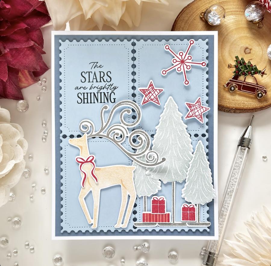 This set comes on two 4" x 6" acetate sheets. The assembled deer with antlers is just over 2 7/8” wide and just over 3 5/8” tall. The stars vary in size from the smallest being just under 3/4" wide and tall and the largest being just under 1 5/8” wide and just over 1 1/2" tall. The bow is just over 1/2" wide and just over 7/8” tall. The larger tree is just under 1 5/8” wide and just over 2 1/2" tall. The smaller tree is just under 1” wide and 1 7/8” tall. The larger tree base (stand) is just over 7/8” wide and just over 1 5/8” tall. The smaller tree base (stand) is just over 5/8” wide and just under 1 1/8” tall. The assembled rectangle present is just over 3/4" wide and 1/4" tall. The small square present is just over 3/8” wide and just under 1/2" tall. The “The Stars Are Brightly Shining” sentiment is just over 1 1/4" wide and just under 1 1/4" tall. The “All Is Calm, All Is Bright” sentiment is just over 2 5/8” wide and just over 1/4" tall. The “Silent Night, Holy Night” sentiment is just under 2 5/8” wide and just over 1/4" tall. The solid string (line) is just under 1/8” wide and just under 2 3/8” tall. The dotted string (line) is just under 1/8” wide and just over 1 3/4" tall.