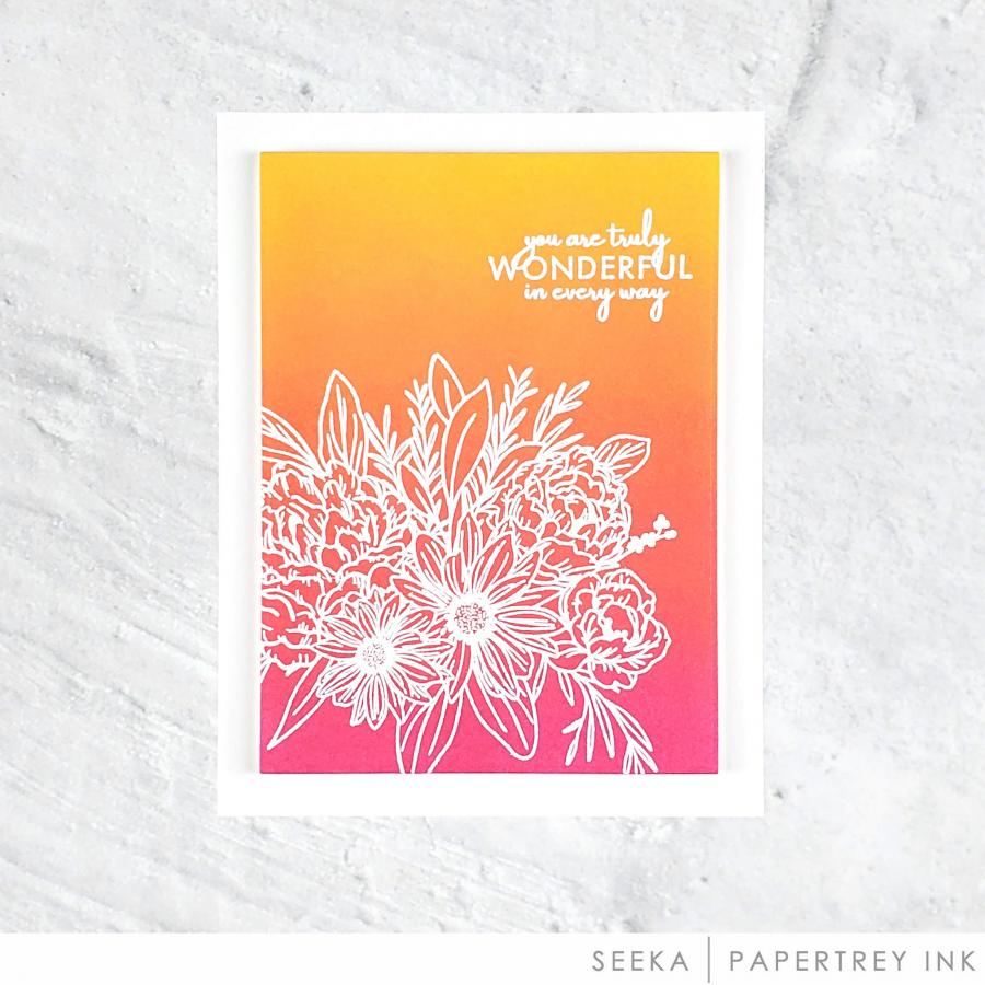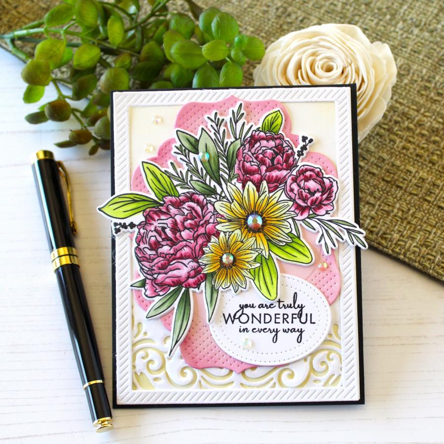 This set comes on a single 4" x 6" acetate sheet. The bouquet is just under 4” wide and just under 3 3/8” tall. The “You Are Truly Wonderful In Every Way” sentiment is just over 1 1/2” wide and just under 7/8” tall. The “Thank You For Always Being There” sentiment is just under 2” wide and just under 5/8” tall. The “Thinking Of You Today” sentiment is just under 1 3/8” wide and just over 1/2” tall. The “Hello Sunshine” sentiment is just under 1 1/4” wide and just over 1/4” tall.