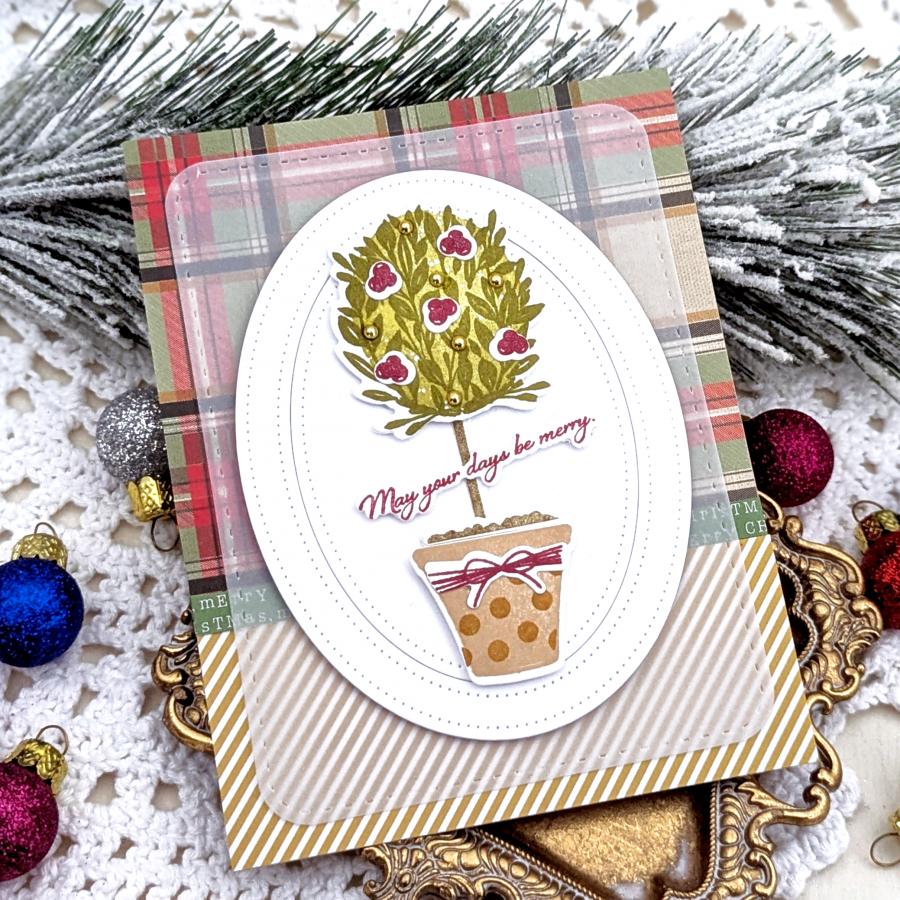 This set comes on a single 4" x 6" acetate sheet. The tall, skinny tree is just under 7/8” wide and just under 2 7/8” tall. The shorter, wider tree is just over 1 3/8” wide and just over 2” tall. The oval shaped tree is just over 1 1/4" wide and just over 1 1/2” tall. The stem bush to go on the oval tree is just over 1 1/2" wide and just under 1 3/4" tall. The pot is just over 1 1/8” wide and just under 1” tall. The pattern overlays for the pot are all approximately just under 1” wide and just under 3/4” tall. The “May Your Days Be Merry” sentiment is just under 1 7/8” wide and just over 1/4" tall. The trio of berries is just under 1/4" wide and tall. The trio of berries is just under 1/4" wide and tall. The string pot wrap with the bow is just under 1” wide and just under 3/8” tall. The larger circle (ornament) is just under 1/4” wide and tall. The smaller circle (ornament) is just over 1/8” wide and tall. The tinsel for the skinny tree is just under 7/8” wide and just over 2 1/4" tall. The stick for the trees is just under 1/8” wide and just under 1 3/4" tall. The larger star tree topper is just over 3/8” wide and just under 5/8” tall. The smaller star tree topper is just over 1/4" wide and 1/2" tall. The remaining greenery vary in size from the smallest being just under 1/4" wide and just over 1/2" tall and the largest being just under 1” wide and just under 1/8” tall.