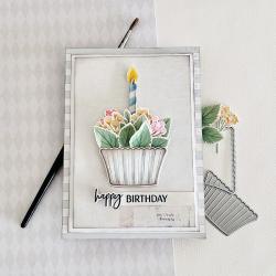 This set comes on two 4" x 6" acetate sheets. The cupcake holder is just over 1 7/8” wide and just under 1 1/8” tall. The assembled single smaller leaf is just under 1/2" wide and just under 3/8” tall. The assembled single larger leaf is just under 7/8” wide and just over 5/8” tall. The assembled double leaf stem is 1 1/4" wide and just under 1 1/8” tall. The assembled stems with flowers vary in size from the smallest being just over 1/2" wide and just under 1” tall and the largest being just under 3/4" wide and just under 1 1/2" tall. The candle is just over 1/8” wide and just over 1 1/2" tall. The assembled flower and stem cupcake toppers vary in size from the smallest being just under 2 1/4” wide and just under 3/4" tall and the largest being just over 2 1/4" wide and just over 3/4" tall. The stems with leaves vary in size from the smallest being just over 3/8” wide and 3/4" tall and the largest being just under 5/8” wide and just over 1 3/8” tall. The remaining single flowers and leaves vary in size from the smallest being just over 1/8” wide and just under 1/8” tall and the largest being just over 1/4" wide and tall. The “Best Wishes” sentiment is just over 5/8” wide and just under 1/8” tall. The “Make a Wish” sentiment just under 7/8” wide and just under 1/8” tall. The “Happy Birthday” sentiment is just under 1” wide and just under 1/8” tall.