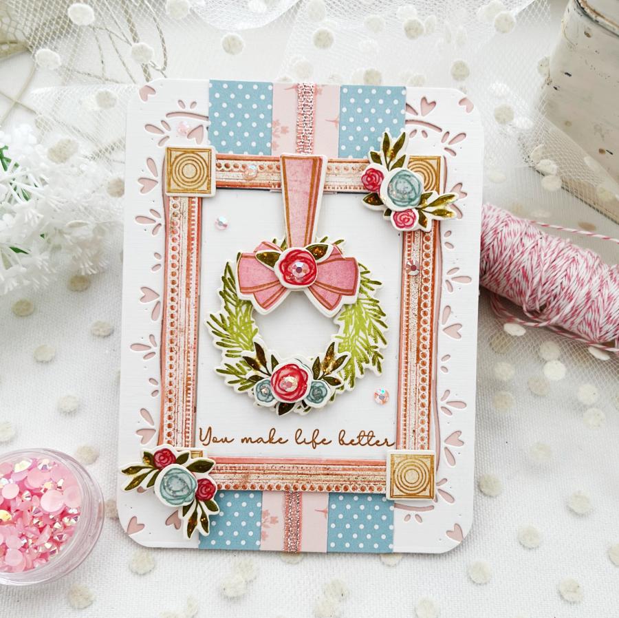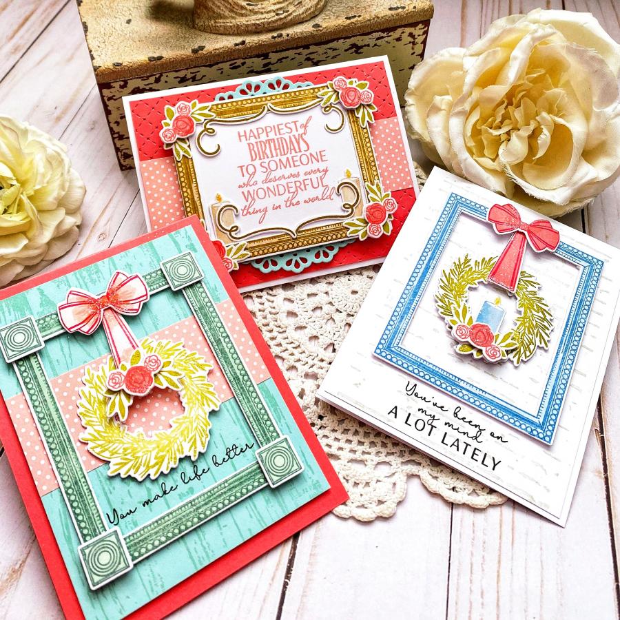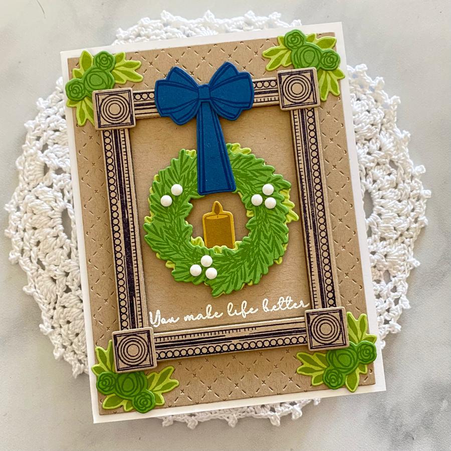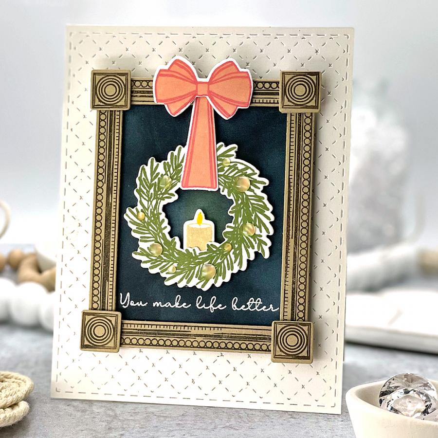 Vintage meets chic with this frame decorating set! The frame itself is uniquely and thoughtfully detailed for a special, one-of-a-kind look. There are elegant florals, trendy flourishes, lit candles, and a beautiful handmade bow you hang the wreath from. Each card you create can be totally unique, and there are a variety of sentiments to choose from so you can easily put your thoughts into words.