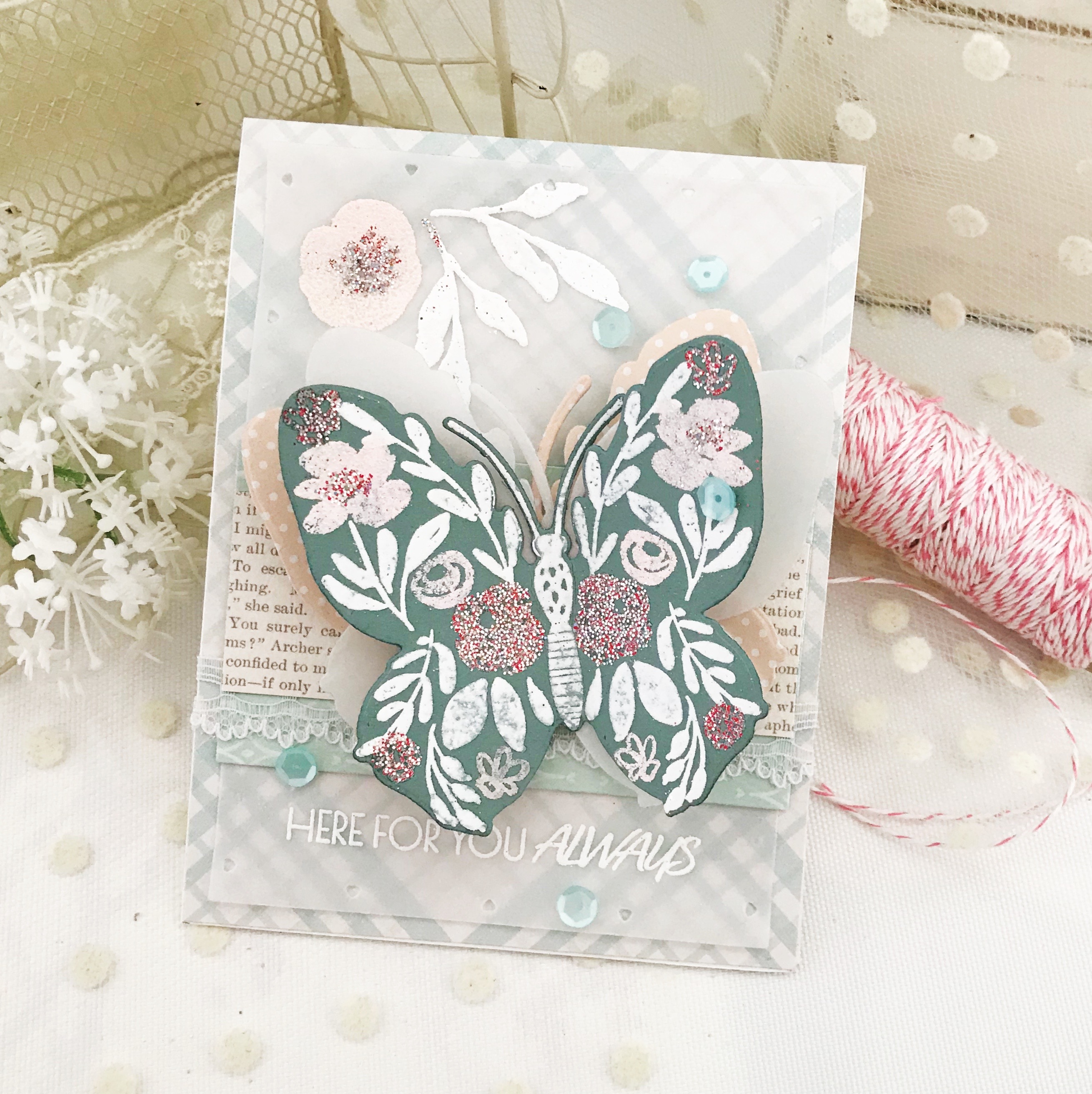 This set comes divided between two 4x6 acetate sheets. The “Here For You Always” sentiments is just over 2 5/8” wide and just under 3/8” tall. The “Spread Your Wings” sentiment is just over 7/8” wide and just over 3/4” tall. The “Hi” sentiment is just over 3/4” wide and just over 5/8” tall. The three leaf stem is just under 3/4” wide and just over 1 3/8” tall. The rounded flower is just over 3/4” wide and just over 3/4” tall. The partial open flower is just over 3/4” wide and just under 3/4” tall. The multi leaf stem is just under 5/8” wide and just under 1 1/8” tall. The assembled floral butterfly is just under 3 1/4” wide and just under 2 3/4” tall.