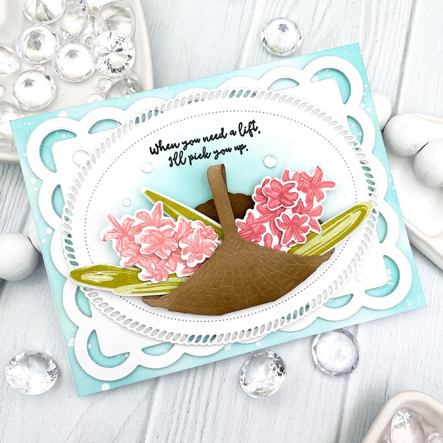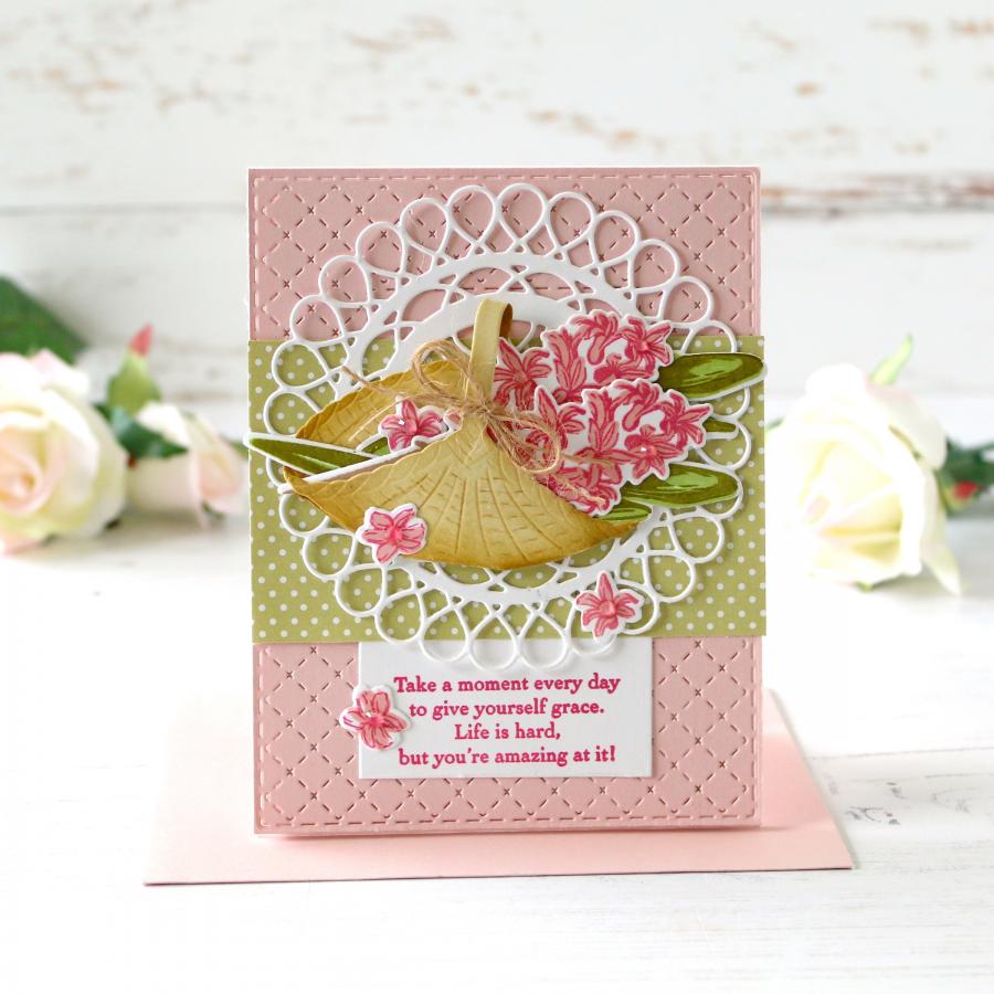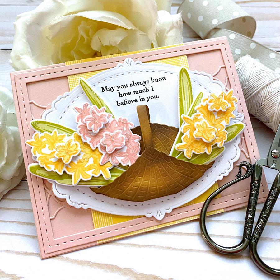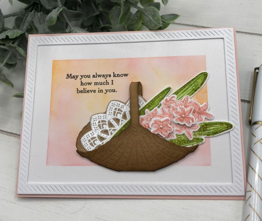 These big, bold blooms are just in time for spring! Each flower and leaf in this Happy Hyacinths set is a two-step stamp making it easy to add realistic depth to each piece. Pair with its coordinating die collection to easily be able to create a layered bouquet with each separate piece. Add an extra touch of charm by coupling this set with the Country Handbasket Die; both carefully designed to coordinate beautifully.