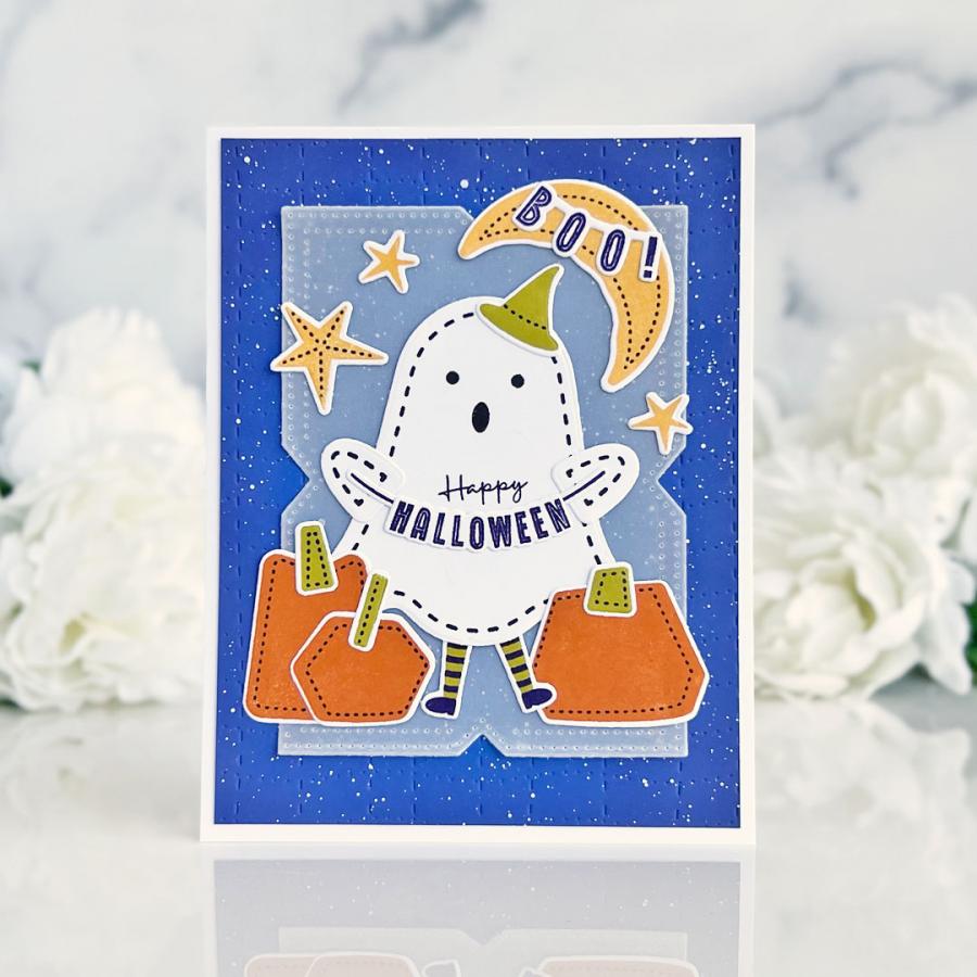 Get ready for a spooky-cute crafting experience with our In Stitches: Halloween stamp set! This delightful set features an adorable ghost with charming stitched edging, ready to be customized with a variety of playful facial expressions and fun accessories, giving your ghost a personality all its own. The set also includes stitched pumpkins and a sweet little banner that the ghost can hold, perfect for adding a festive touch to your Halloween cards. This set is a must-have for celebrating the spooky season ahead!