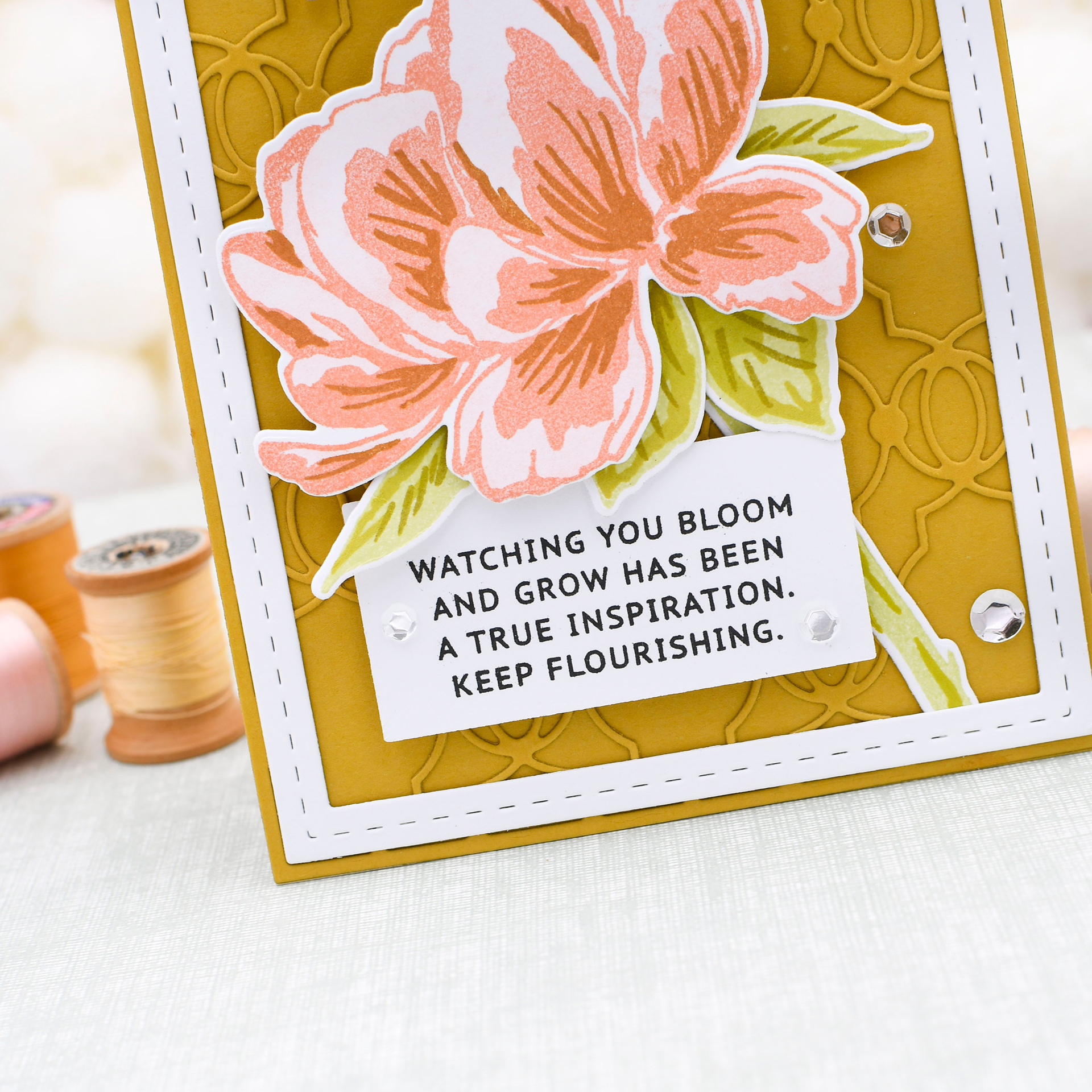 Many of us struggle when it comes to filling the space on the inside of our greeting cards. With Inside Greetings, a series of sentiment stamps, we’ve done the work for you! These longer messages in simple fonts take the guesswork out of that task. Bloom features 3 messages designed to celebrate an individual’s beauty and growth!