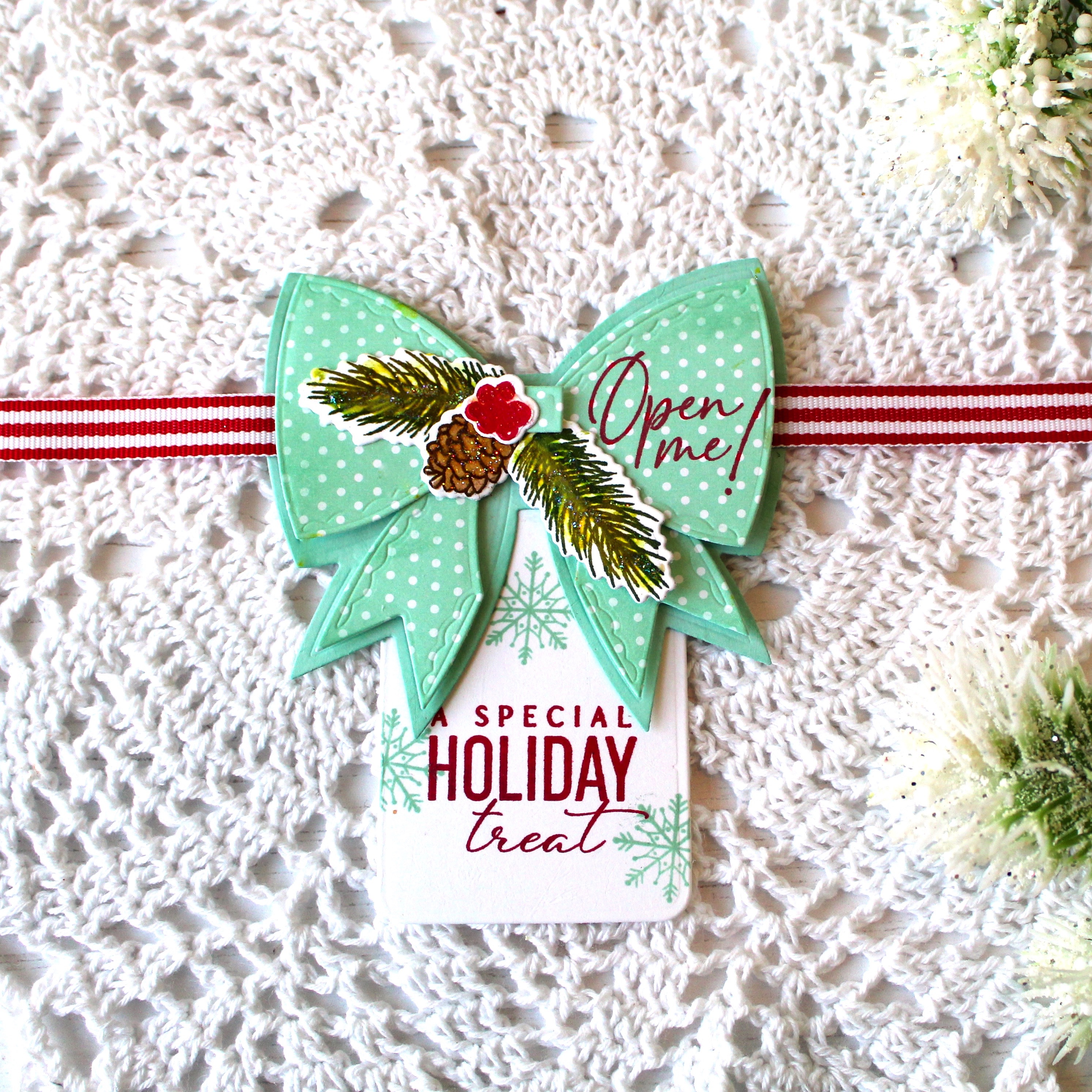 This set comes on a single 3" x 4" acetate sheet. The “A Special Holiday Treat” is just under 1 3/8” wide and 7/8” tall. The “Best Gift Ever” sentiment is just over 1 1/8” wide and just under 1 1/4” tall. The “Wishing You The Sweetest Holiday Season” sentiment is just over 1 3/8” wide and just under 1” tall. The “A Gift For You” sentiment is 1 1/8” wide and just under 1 1/4” tall. The “Special Delivery From The North Pole” sentiment is 1 1/8” wide and just under 1 1/4” tall. The “Open Me” sentiment is 1 1/8” wide and just over 7/8” tall.