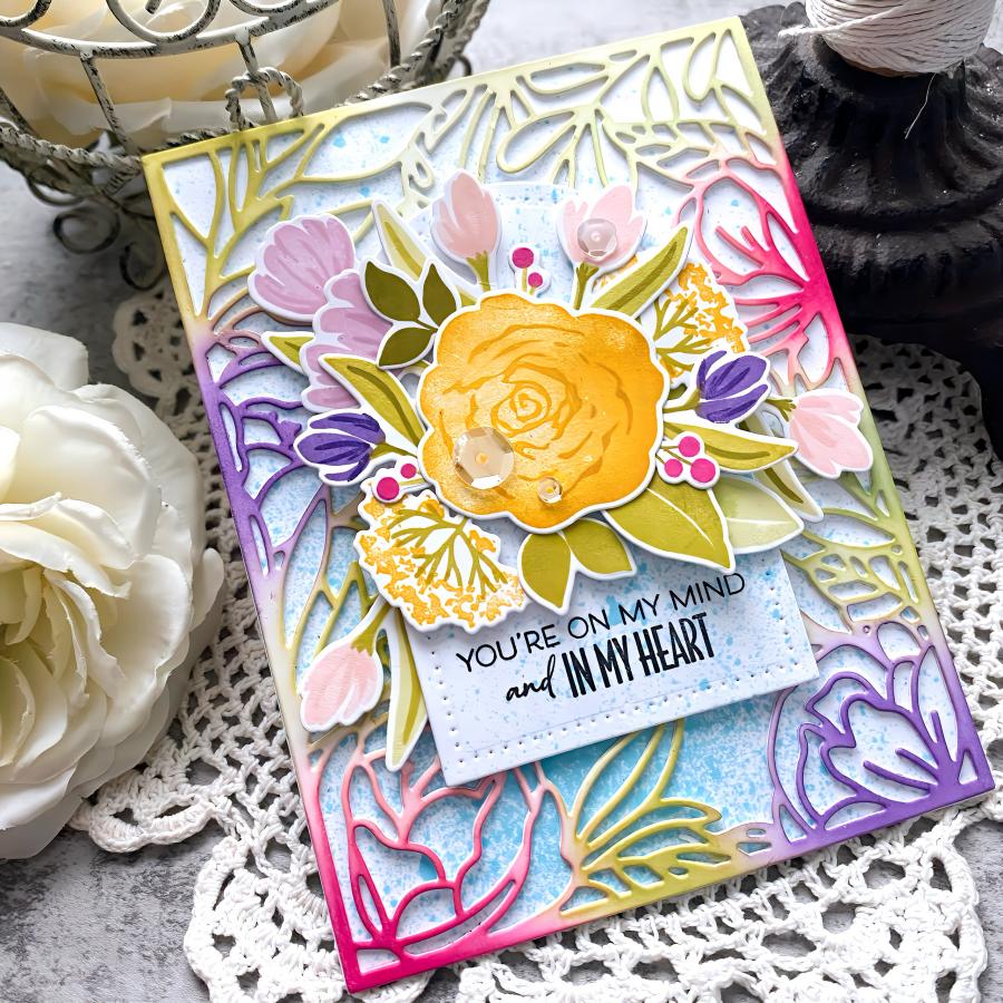 This set comes on a single 3" x 4" acetate sheet. The “You’re on my mind and in my heart” sentiment is 1 7/8” wide and just under 1/2” tall. The “You have been in my thoughts” sentiment is 1 1/8” wide and just under 3/4” tall. The “Sending you love + strength with each new day” sentiment is just under 1 3/4” wide and 5/8” tall. The “Sending positive vibes & encouragement your way” sentiment is just over 1 1/2” wide and just over 7/8” tall. The “May warm and cheerful thoughts…” sentiment is just under 1 3/4” wide and just under 1” tall. The “Thinking of all the wonderful things you do…” sentiment is 2 1/4” wide and just under 3/4” tall.