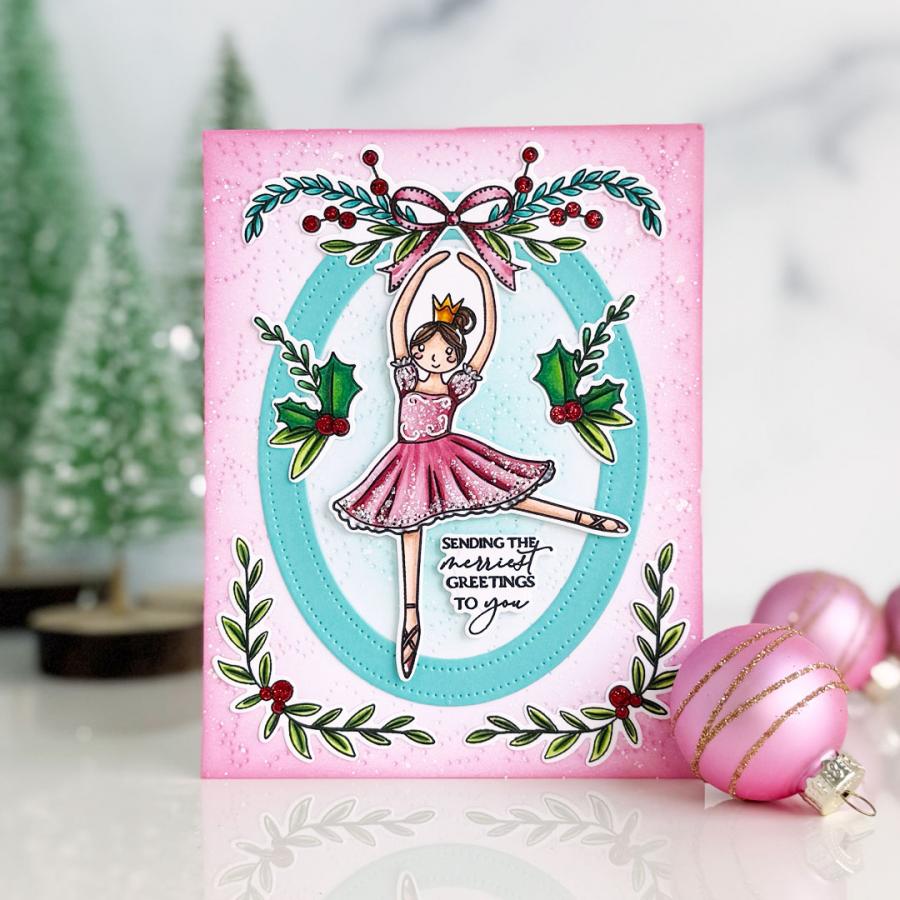 This set comes on two 4" x 6" acetate sheets. Clara is just under 2 1/4" wide and just under 3 1/8” tall. The Sugar Plum Fairy is just under 2 1/2” wide and just under 3 5/8” tall. The Mouse King is just over 1 1/4” wide and just over 3 1/8” tall. The mini nutcracker is just under 1/2” wide and just under 1 5/8” tall. The nutcracker with beard is just over 1” wide and just under 3 3/8” tall. The nutcracker with the crown is just under 1” wide and just over 3 1/4" tall. The decorative greenery vary in size from the smallest being just under 1 1/8” wide and just under 1 1/4” tall and the largest being 3 1/2" wide and just over 1 1/8” tall. The stars vary in size from the smallest being just under 1/4” wide and just under 3/8” tall and the largest being just under 1 1/8” wide and tall. The “Wishing You An Enchanting Holiday Season Filled…” is just under 1 3/8” wide and just over 7/8” tall. The “Let The Magic Of The Season Begin” sentiment is just over 1 3/4” wide and just over 5/8” tall. The “Sending The Merriest Greetings To You” sentiment is just over 7/8” wide and just over 3/4” tall.