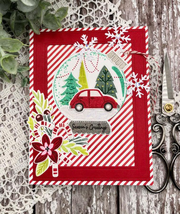 This set comes on two 4" x 6" acetate sheets. The assembled ornament cloche with base is just over 2 5/8” wide and just under 3” tall. The dangling lights are just under 2 3/8” wide and just over 7/8” tall. The assembled car is just over 1 3/4” wide and just over 3/4” tall. The greenery vary in size from the largest being just under 1 1/4” wide and just over 1 1/8” tall and the smallest being just under 3/8” wide and just under 5/8” tall. The snow is just under 2” wide and 1/2” tall. The assembled candy cane is just over 5/8” wide and 1 3/4” tall. The assembled large flower is just under 1 1/8” wide and just over 1” tall. The assembled small flower is just over 3/8” wide and just under 1/2” tall. The first assembled berry is 1/4” wide and just over 1/4” tall. The second berry is just under 1/4” wide and tall. The assembled long triangle shaped tree with lines is just over 3/4” wide and just over 1 7/8” tall. The assembled tree with the branches and ornaments is just under 7/8” wide and just over 1 3/8” tall. The remaining tree is just over 7/8” wide and just under 1 3/8” tall. The “Season’s Greetings” sentiment is just under 1 1/4” wide and just over 1/4” tall. The “Happy Holidays” sentiment is just under 1 1/4” wide and just over 1/4” tall. The “Joyful Wishes” sentiment is just under 1” wide and just over 1/4” tall. The star is 1/4” wide and tall.