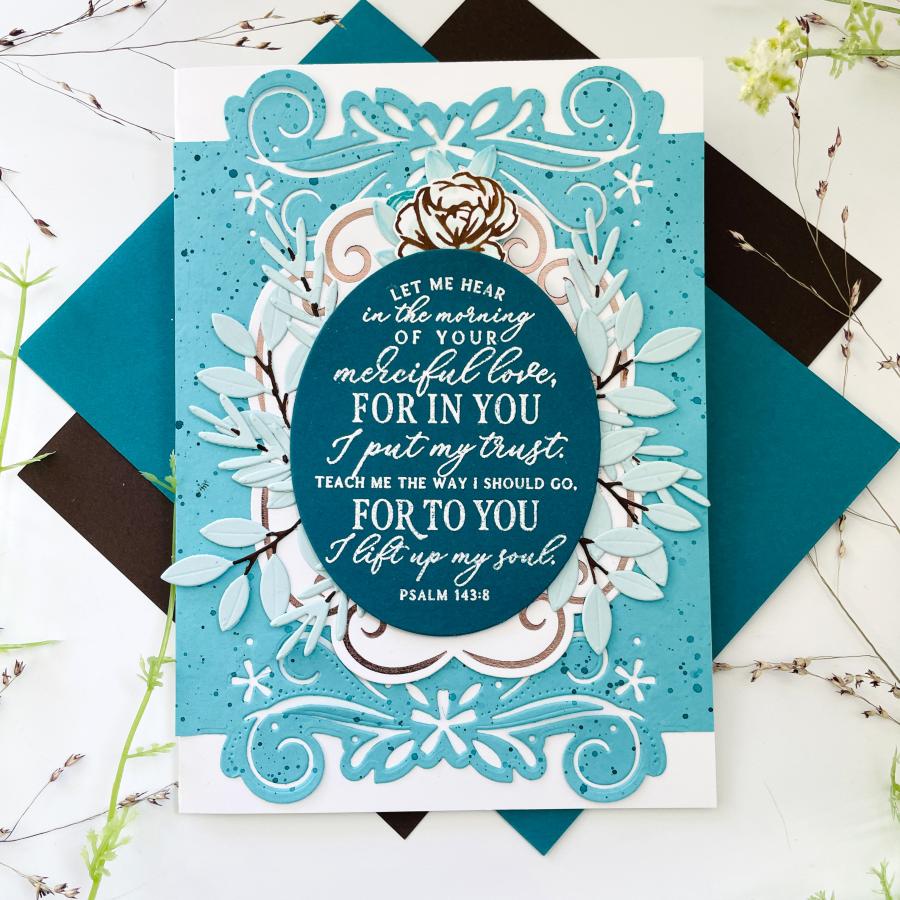 This set comes on a single 3" x 4" acetate sheet. The psalm is just under 2 1/2” wide and just over 3” tall.