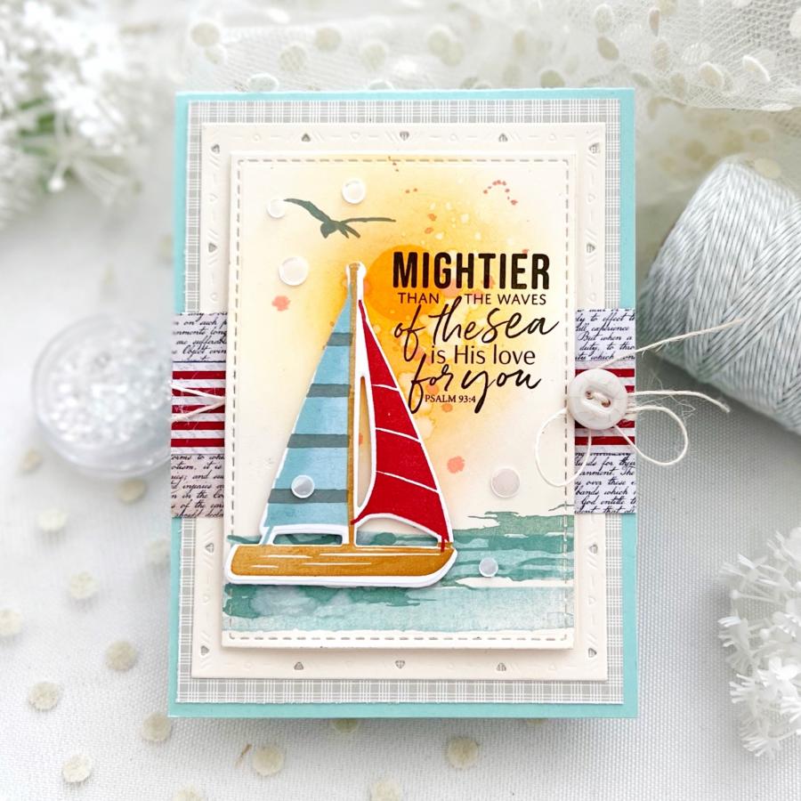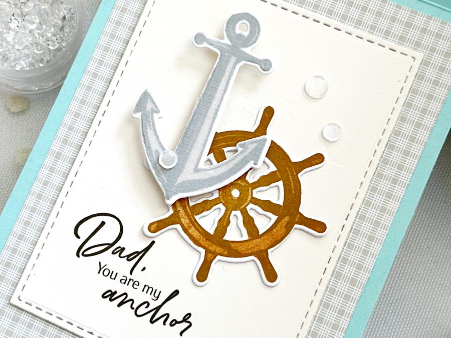 This set comes on two 4”x 6“ acetate sheets. The assembled ship wheel is just under 2 1/8” wide and tall. The assembled anchor is just under 1 1/2” wide and just over 2 1/4” tall. The assembled sailboat is just over 1 7/8” wide and 2 3/4” tall. The sun is just over 5/8” wide and just under 3/4” tall. The first seagull silhouette is 1” wide and just under 3/8” tall. The second seagull silhouette is just over 3/4” wide and just under 3/8” tall. The solid watercolor stroke is just over 4 1/4” wide and just over 3/8” tall. The loose watercolor stroke is just under 4” wide and just over 1/2” tall. The “Dad, You Are My Anchor” sentiment is just under 1 5/8” wide and just over 7/8” tall. The “There Is No One I Would Rather Sail Through Life With” sentiment is just over 1 5/8” wide and just under 5/8” tall. The “Mightier Than The Waves Of The Sea Is His Love For You” sentiment is just under 1 1/2” wide and just over 1 3/8” tall. The “Life’s Roughest Storms Prove The Strength Of Our Anchors” sentiment is just under 2” wide and just under 1 3/4” tall.