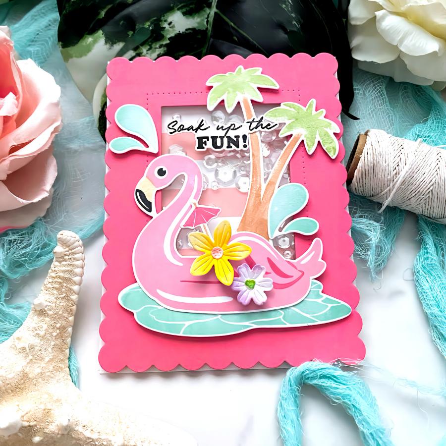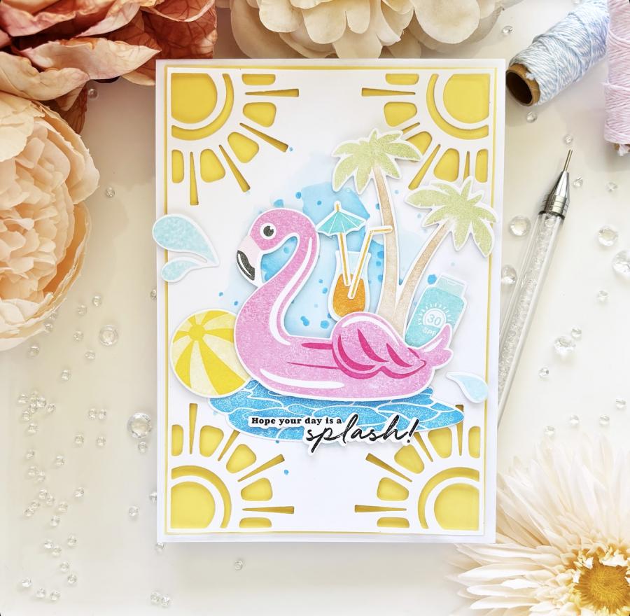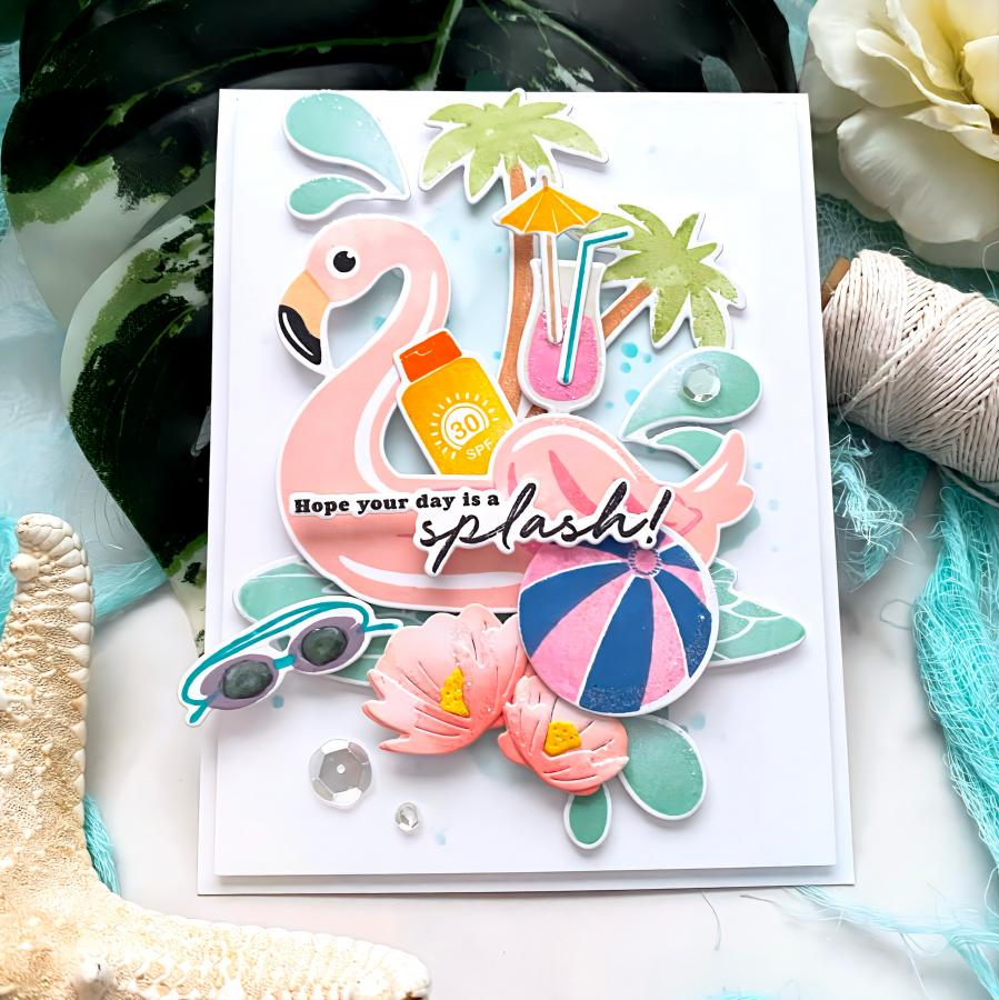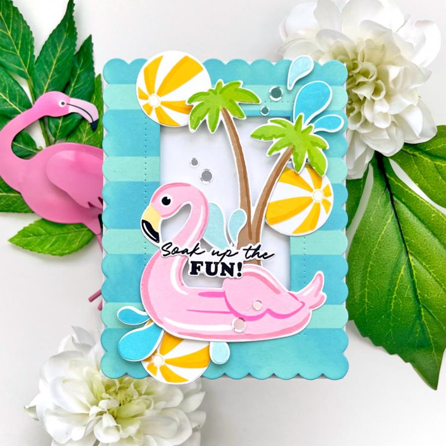 Jump into summer with the Soak Up the Fun stamp set! Perfect for creating a vibrant poolside scene, this set features a fun flamingo floatie, stylish sunglasses, playful goggles, and so many other festive pool necessities. Whether you enjoy sipping on a frozen drink by the pool or love exploring underwater, this set is sure to make a big splash on all of your summer cards!