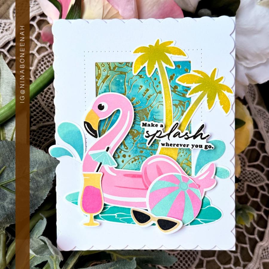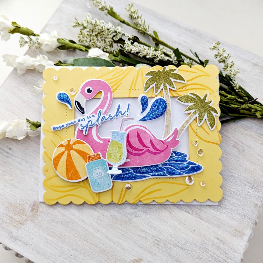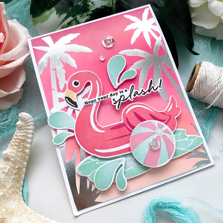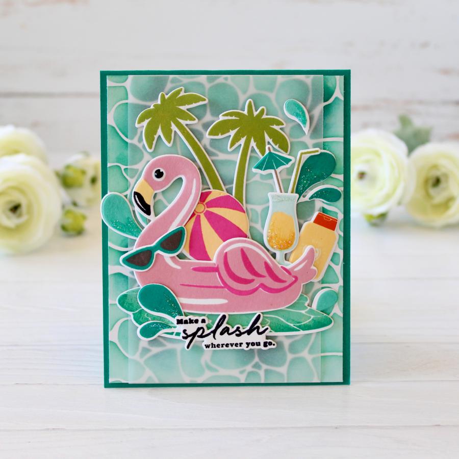 This set comes on two 4" x 6" acetate sheets. The assembled flamingo pool float is just over 3 1/8” wide and just over 2 5/8” tall. The pool water is just under 3 3/4” wide and just under 1” tall. The assembled sunscreen bottle is just under 5/8” wide and just under 1 1/8” tall. The silhouette palm trees are just under 2 1/2" wide and just under 3 1/4" tall. The assembled beach ball is just under 1 1/4" wide and tall. The assembled drink in cup is just over 1/2" wide and just under 1 1/4" tall. The assembled drink umbrella is just over 5/8” wide and just over 1 1/8” tall. The straw is just over 3/8” wide and just over 1” tall. The assembled goggles are just over 1 3/8” wide and just over 3/8” tall. The assembled sunglasses are just under 1 1/4” wide and just under 3/8” tall. The “Make A Splash Wherever You Go” sentiment is just over 1 5/8” wide and just under 5/8” tall. The “Soak Up The Fun” sentiment is just over 1 7/8” wide and just over 1/2” tall. The “Hope Your Day Is A Splash” sentiment is just over 2 3/8” wide and just over 1/2" tall. The right and left facing double water droplet “splash” are both just over 3/4” wide and just over 7/8” tall. The right and left facing single water droplet “splash” are both just over 1/2” wide and just under 3/8” tall.
