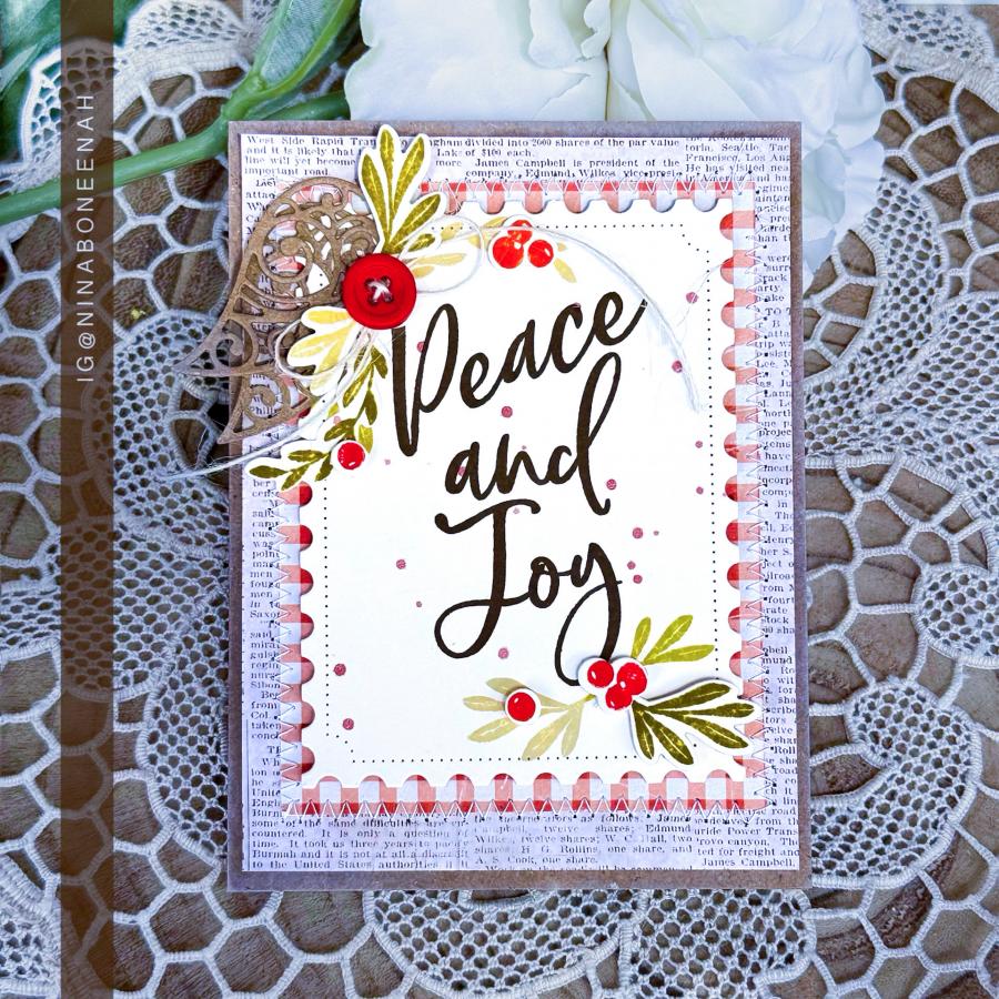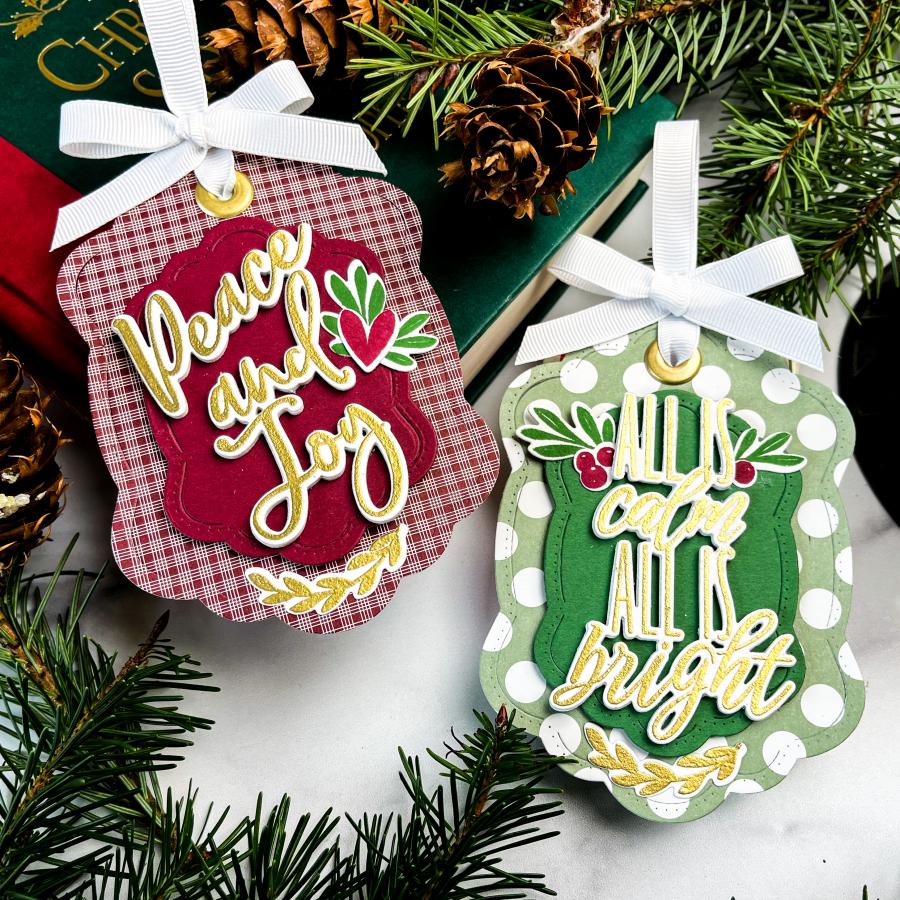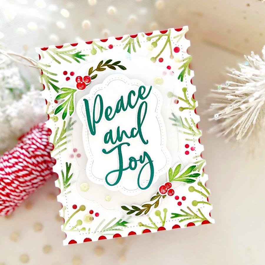 This set comes on two 4" x 6" acetate sheets. The “Merry Christmas To You” sentiment is just over 2 1/8” wide and just over 2” tall. The “Joy To The World” sentiment is 1 7/8” wide and just over 2 7/8” tall. The “Peace And Joy” sentiment is just over 1 7/8” wide and just over 2 3/4" tall. The “All Is Calm All Is Bright” sentiment is just over 2” wide and just under 3 1/8” tall. The “Season’s Greetings” sentiment is just under 2 1/2" wide and just over 1 5/8” tall. The “O Holy Night” sentiment is just under 2 1/4" wide and just over 3 1/8” tall. The remaining leaves/stems/berries vary in size from the smallest being just under 1/4” wide and just over 1/8” tall and the largest being just under 1 3/8” wide and just under 1/2” tall.