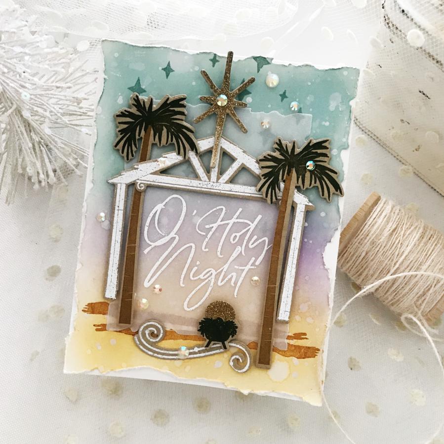 This set comes on two 4”x 6“ acetate sheets. The stable is just under 3 3/8” wide and just under 2 7/8” tall. The assembled palm tree is just under 1 3/8” wide and 3 3/4” tall. The Star of Bethlehem is just under 7/8” wide and just under 1 7/8” tall. The single small star is 3/8” wide and just under 5/8” tall. The trio of stars is just under 3/4” wide and just over 1” tall. The assembled manger is just over 5/8” wide and just under 3/4” tall. The swirl line is just under 1” wide and just over 1/2” tall. The “O’ Holy Night” sentiment is just under 2 1/8” wide and just under 1 7/8” tall. The “The Greatest Gift Did Not Come Wrapped With Ribbons Or Bows” sentiment is just over 2 1/2” wide and just over 1 1/8” tall. The “Rather He Was Wrapped In Swaddling Clothes And Laid In A Manger” sentiment is just over 2 5/8” wide and just under 1 3/4” tall. The “It Is The Night Of The Dear Savior’s Birth” sentiment is just over 2” wide and just under 1 5/8” tall. The “For Unto Us A Child Is Born” sentiment is just under 2 1/4” wide and just under 1 1/2” tall. The sand swipe is just under 3 3/4” wide and just over 1/4” tall.