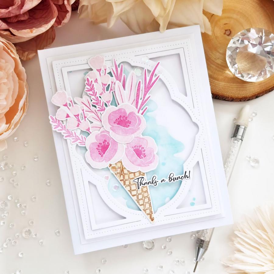 This set comes on two 4" x 6" acetate sheets. The assembled waffle cone is just over 1 1/4" wide and just over 3” tall. The assembled florals vary in size from the smallest being just under 3/4" wide and just over 1/2" tall and the largest being just over 3/4" wide and just over 2 1/8” tall. The assembled/non assembled greenery and stems vary in size from the smallest being just over 3/8” wide and just over 1 1/2" tall and the largest being just under 7/8” wide and just over 2 3/8” tall. The smaller assembled leaf is just under 1/2" wide and just under 3/4" tall. The larger assembled leaf is just over 1/2” wide and just over 1” tall. The “You’re A Whole Bunch Of Wonderful” sentiment is just under 1 3/4" wide and just over 1/2" tall. The “Thanks A Bunch” sentiment is 1 3/4" wide and just under 3/8” tall.