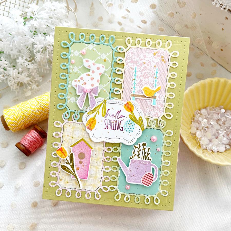 This set comes on a single 4" x 6" acetate sheets. The assembled birdhouse is just under 3/4” wide and 1 1/4" tall. The right-facing bunny is just over 7/8” wide and tall. The left-facing bunny is just over 7/8” wide and 1 1/4" tall. The assembled decorative flower is just over 5/8” wide and just under 1” tall. The assembled bird swing is just over 3/4” wide and just under 1 1/8” tall. The bird is just over 1/2" wide and just over 1/4" tall. The bow is just under 5/8” wide and just under 3/4" tall. The egg is just under 3/8” wide and just over 3/8” tall. The mug is just over 3/4" wide and just over 3/8” tall. The florals vary in size from the smallest being just over 1/4” wide and just under 3/8” tall and the largest being 1/2” wide and just over 1 1/8” tall. The watering can is just over 1 1/4" wide and just under 3/4" tall. The bowl is just under 1” wide and just over 3/8” tall. The “Happy Easter” sentiment is just under 5/8” wide and just under 3/4” tall. The “Hello Spring” sentiment is just under 5/8” wide and just over 5/8” tall. The “Where Flowers Bloom So Does Hope” quote is just over 1/2" wide and just under 1” tall.