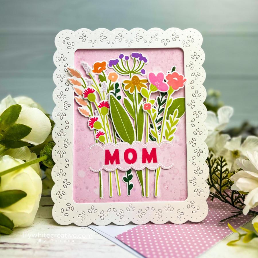 This set comes on two 4" x 6" acetate sheets. The assembled flowers vary in size from the tallest being just under 7/8” wide and the shortest being just under 3/4” wide and just under 3 1/8” tall. The larger single leaf is just under 1/2” wide and just over 1 5/8” tall. The smaller single leaf is just over 1/2” wide and just over 3/4” tall. The “Friend” word is just over 2 1/4” wide and just over 3/8” tall. The all capitalized “Mom” word is just under 1 1/2” wide and just over 3/8” tall. The script “Mom” word is just over 1” wide and just under 1/2” tall. The “So Lucky I Get To Call You My” sentiment is just under 1” wide and just over 3/4” tall. The “Most Amazing” sentiment is just over 1 1/4” wide and just over 1/8” tall.
