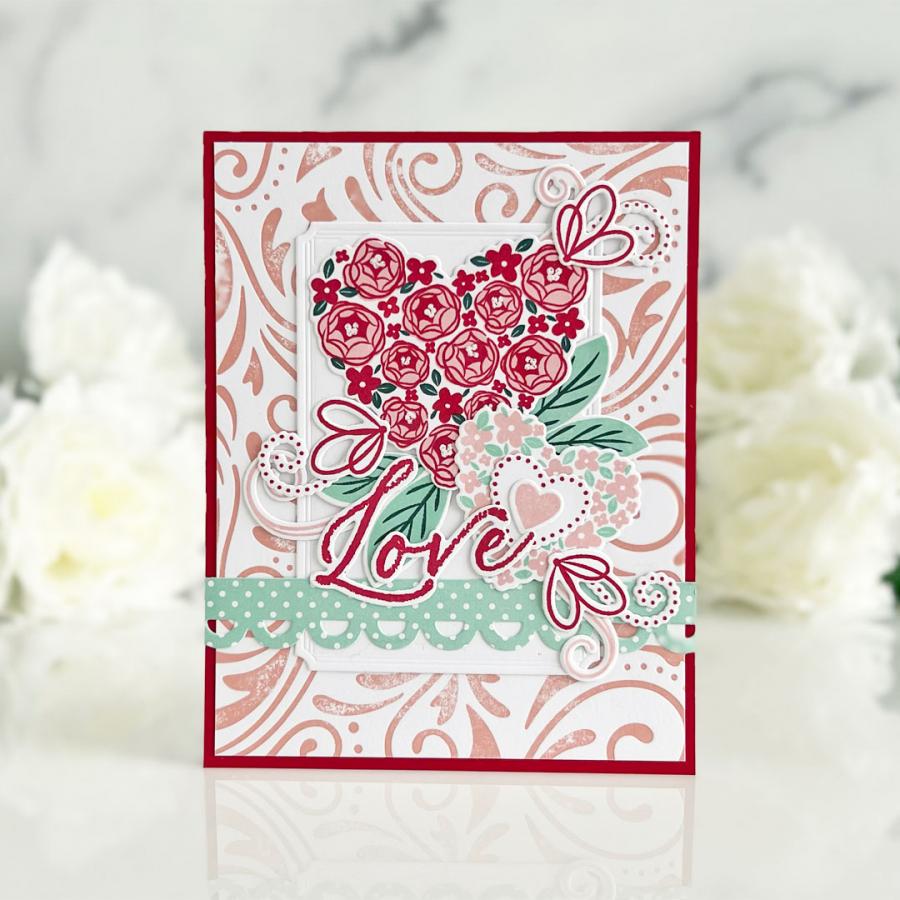 May your heart be filled with love when you see this beautiful set! Layer-able florals pieced together creates a lovely bouquet in the shape of a heart! Add the delicate swirly ribbons to the bottoms of the heart for an instant balloon or just a simple decorative touch! Pick from one of the “love” themed sentiments for the perfect completed card every time.