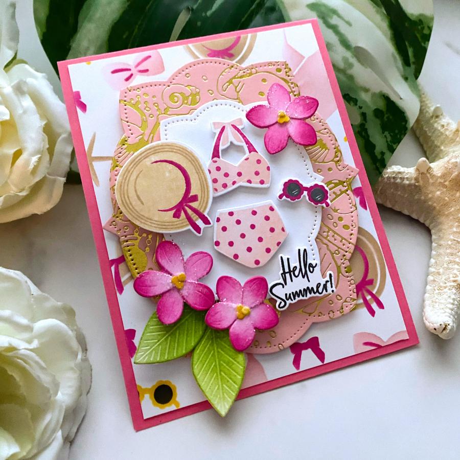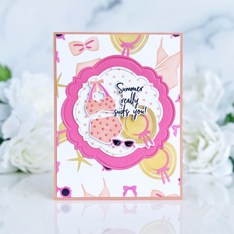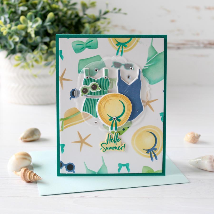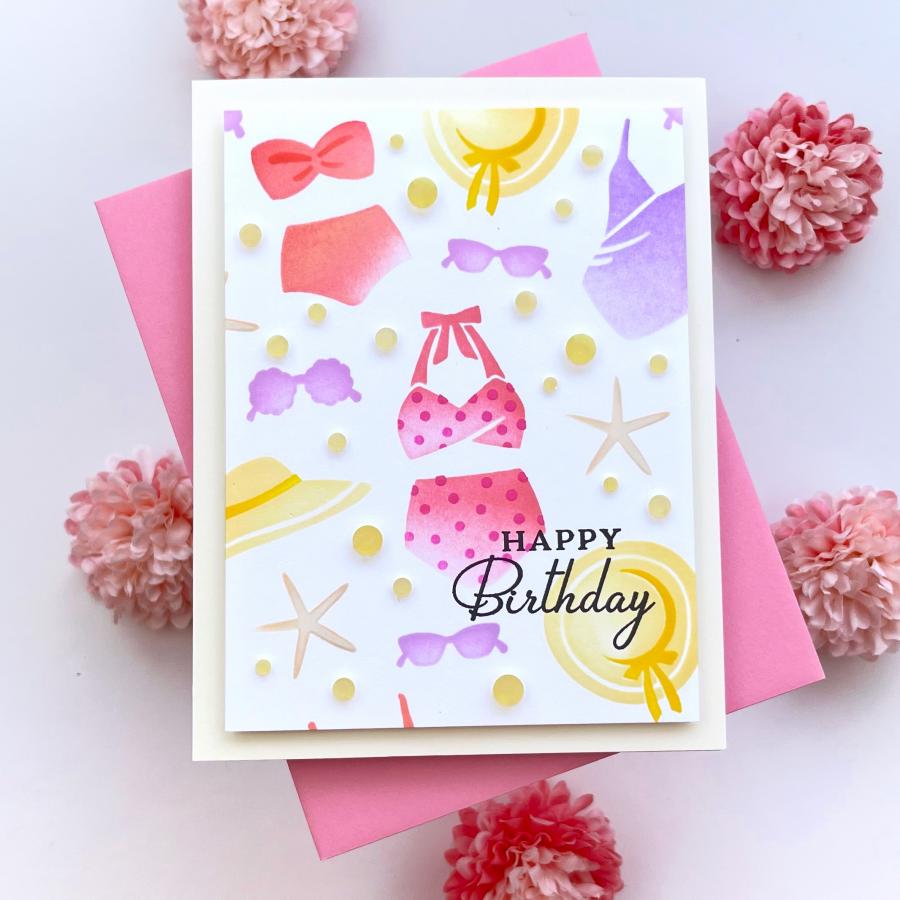 While this stencil collection “suits” the Suited for Summer Stamp Set perfectly, it also stands on its own as a delightful and chic summer background. Adorable swimsuits, stylish sunglasses, and sleek sun hats come together to make a splash on all of your summer creations. This easily layer-able set makes it easy to create the perfect background celebrating summer year after year!